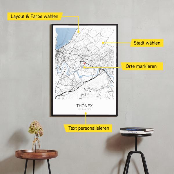 Wähle Farben und Layouts, die perfekt zu dir passen. Ob als klassische Karte in schwarz-weiß oder in modernen Farben. Bei Cartida kannst du ein Design in deinen Lieblingsfarben wählen. Erstelle eine Variante von Thônex, die perfekt zu dir und deiner Wohnung passt.
