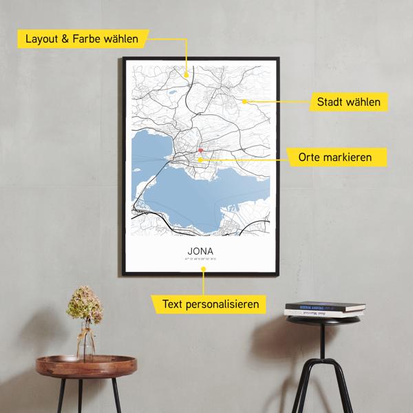 Wähle Farben und Layouts, die perfekt zu dir passen. Ob als klassische Karte in schwarz-weiß oder in modernen Farben. Bei Cartida kannst du ein Design in deinen Lieblingsfarben wählen. Erstelle eine Variante von Jona, die perfekt zu dir und deiner Wohnung passt.