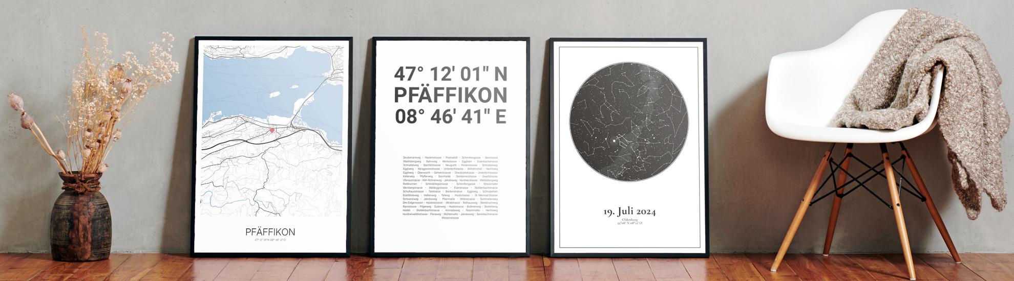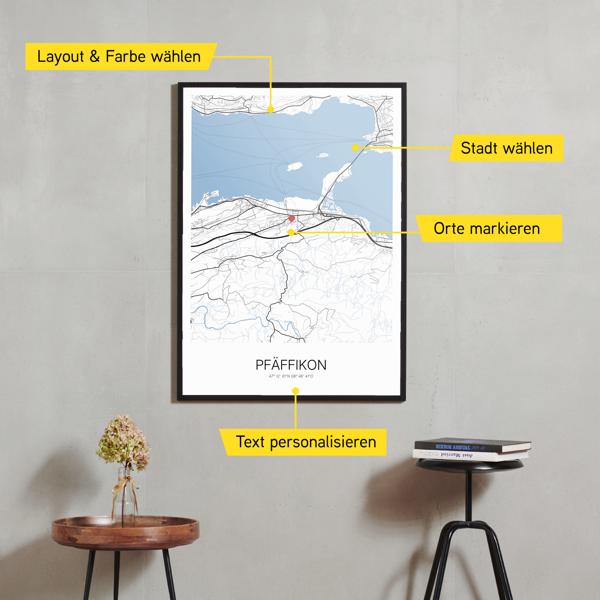 Wähle Farben und Layouts, die perfekt zu dir passen. Ob als klassische Karte in schwarz-weiß oder in modernen Farben. Bei Cartida kannst du ein Design in deinen Lieblingsfarben wählen. Erstelle eine Variante von Pfäffikon, die perfekt zu dir und deiner Wohnung passt.
