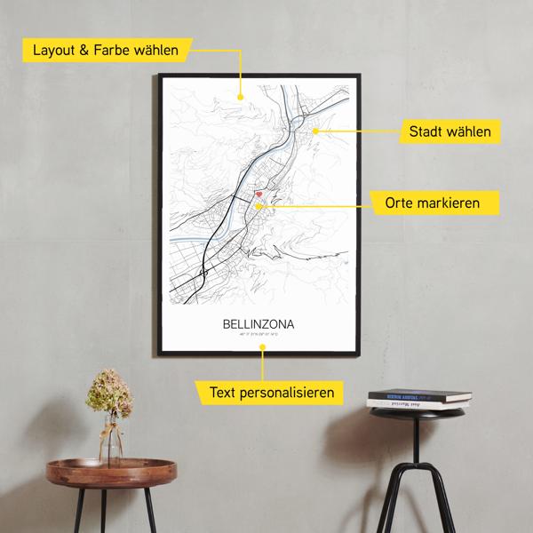 Wähle Farben und Layouts, die perfekt zu dir passen. Ob als klassische Karte in schwarz-weiß oder in modernen Farben. Bei Cartida kannst du ein Design in deinen Lieblingsfarben wählen. Erstelle eine Variante von Bellinzona, die perfekt zu dir und deiner Wohnung passt.