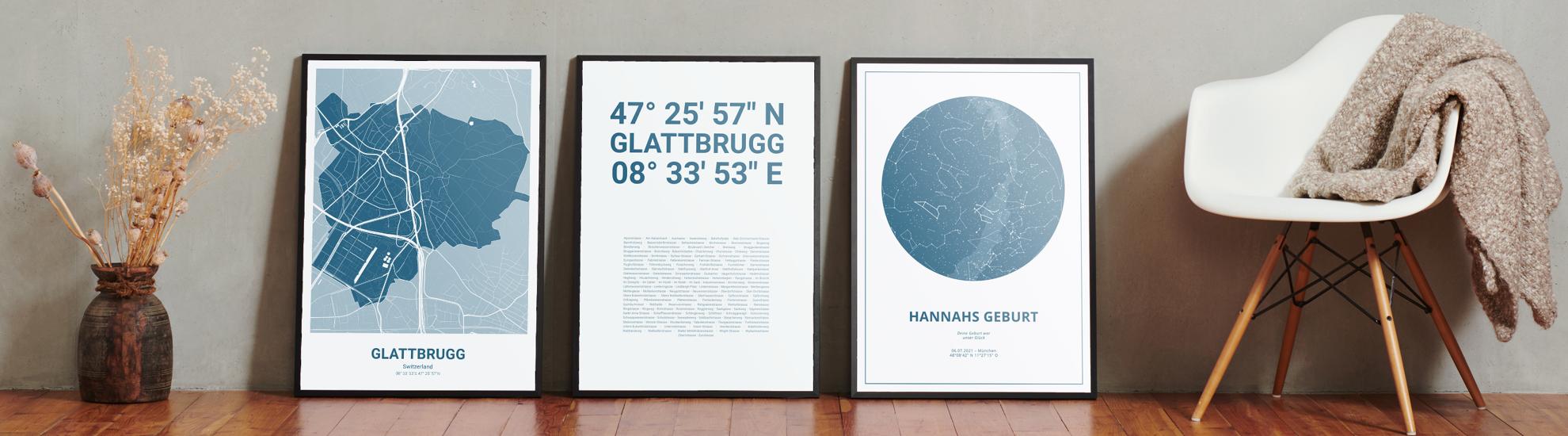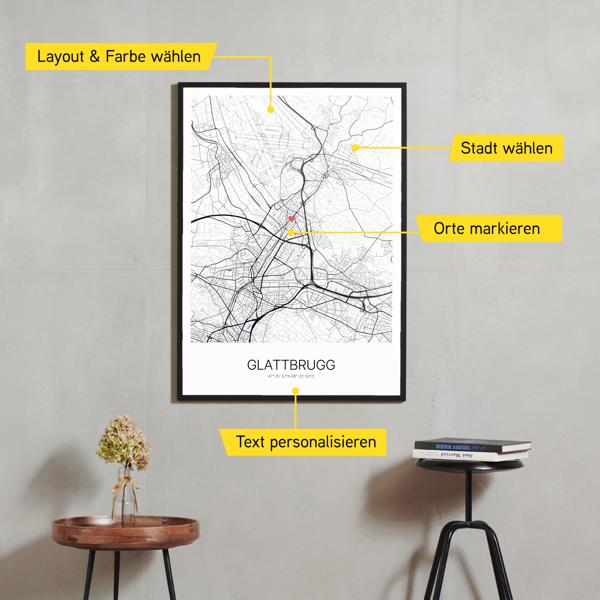 Wähle Farben und Layouts, die perfekt zu dir passen. Ob als klassische Karte in schwarz-weiß oder in modernen Farben. Bei Cartida kannst du ein Design in deinen Lieblingsfarben wählen. Erstelle eine Variante von Glattbrugg, die perfekt zu dir und deiner Wohnung passt.