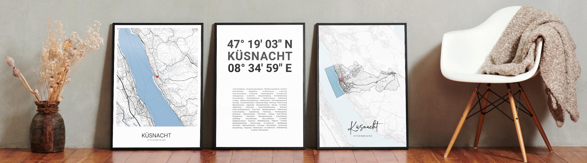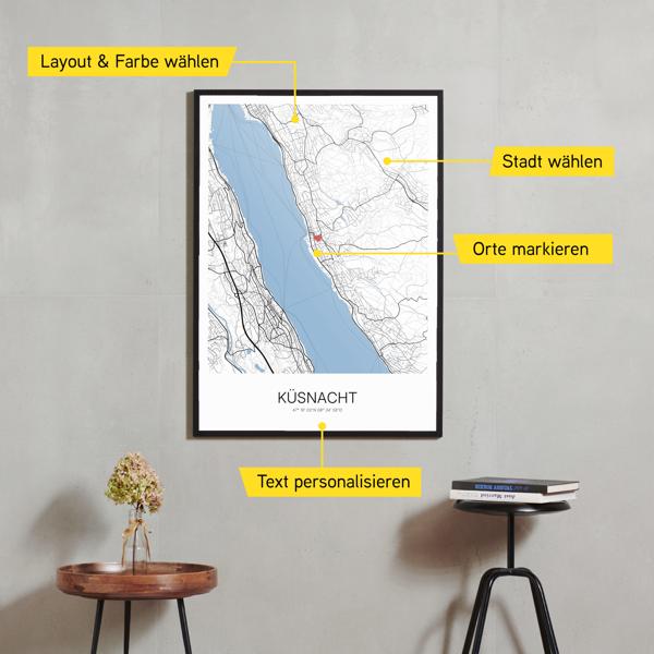 Wähle Farben und Layouts, die perfekt zu dir passen. Ob als klassische Karte in schwarz-weiß oder in modernen Farben. Bei Cartida kannst du ein Design in deinen Lieblingsfarben wählen. Erstelle eine Variante von Küsnacht, die perfekt zu dir und deiner Wohnung passt.
