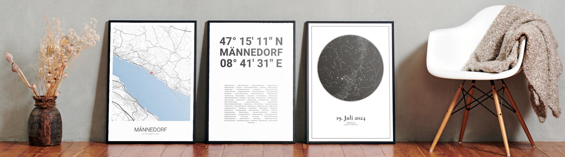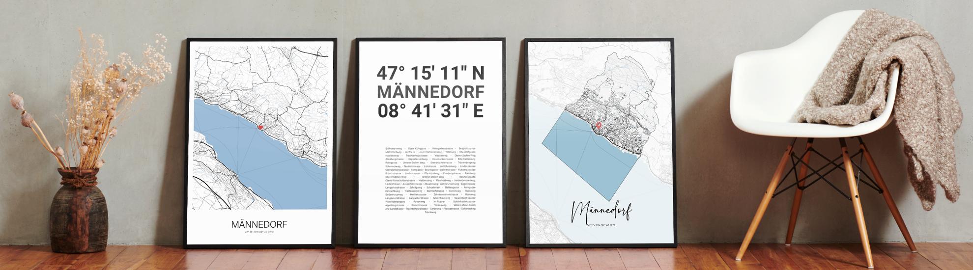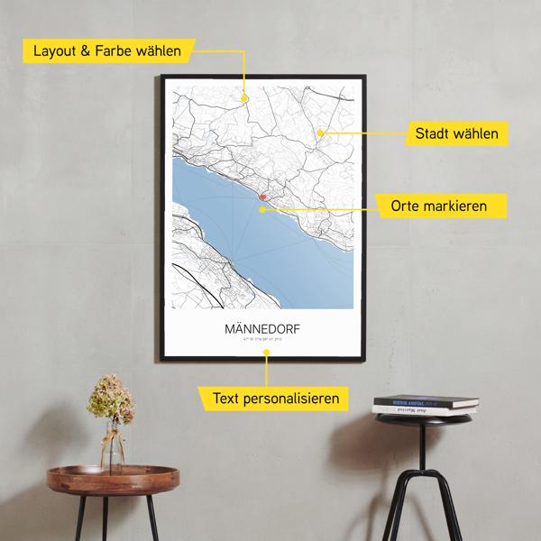 Wähle Farben und Layouts, die perfekt zu dir passen. Ob als klassische Karte in schwarz-weiß oder in modernen Farben. Bei Cartida kannst du ein Design in deinen Lieblingsfarben wählen. Erstelle eine Variante von Männedorf, die perfekt zu dir und deiner Wohnung passt.