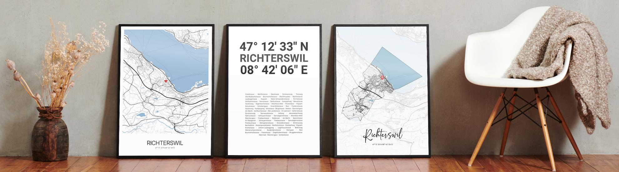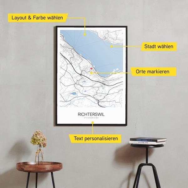 Wähle Farben und Layouts, die perfekt zu dir passen. Ob als klassische Karte in schwarz-weiß oder in modernen Farben. Bei Cartida kannst du ein Design in deinen Lieblingsfarben wählen. Erstelle eine Variante von Richterswil, die perfekt zu dir und deiner Wohnung passt.