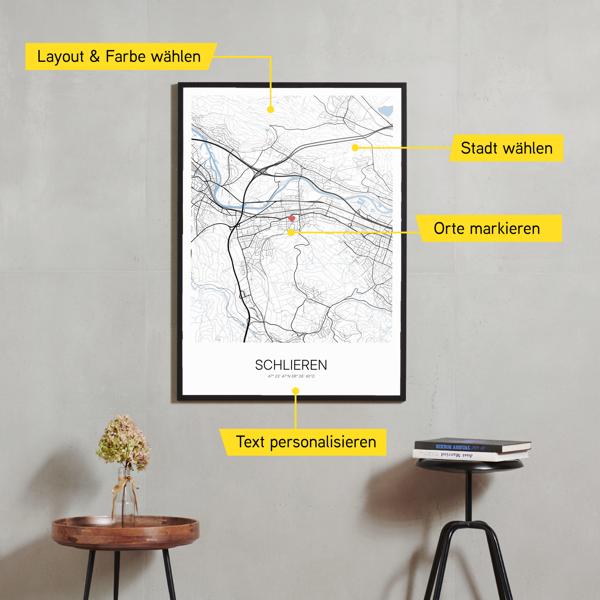 Wähle Farben und Layouts, die perfekt zu dir passen. Ob als klassische Karte in schwarz-weiß oder in modernen Farben. Bei Cartida kannst du ein Design in deinen Lieblingsfarben wählen. Erstelle eine Variante von Schlieren, die perfekt zu dir und deiner Wohnung passt.
