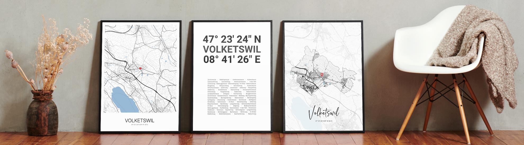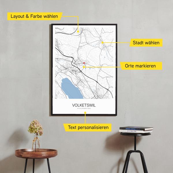 Wähle Farben und Layouts, die perfekt zu dir passen. Ob als klassische Karte in schwarz-weiß oder in modernen Farben. Bei Cartida kannst du ein Design in deinen Lieblingsfarben wählen. Erstelle eine Variante von Volketswil, die perfekt zu dir und deiner Wohnung passt.