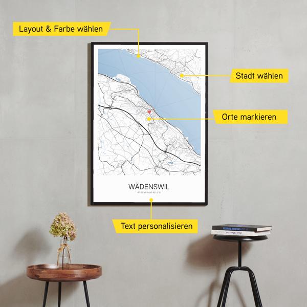 Wähle Farben und Layouts, die perfekt zu dir passen. Ob als klassische Karte in schwarz-weiß oder in modernen Farben. Bei Cartida kannst du ein Design in deinen Lieblingsfarben wählen. Erstelle eine Variante von Wädenswil, die perfekt zu dir und deiner Wohnung passt.