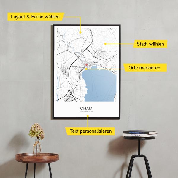 Wähle Farben und Layouts, die perfekt zu dir passen. Ob als klassische Karte in schwarz-weiß oder in modernen Farben. Bei Cartida kannst du ein Design in deinen Lieblingsfarben wählen. Erstelle eine Variante von Cham, die perfekt zu dir und deiner Wohnung passt.