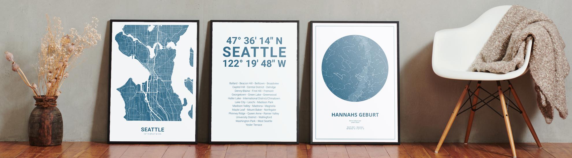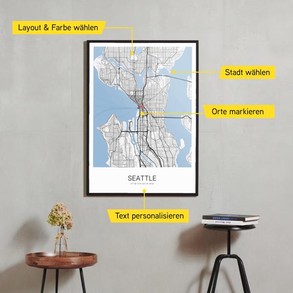 Wähle Farben und Layouts, die perfekt zu dir passen. Ob als klassische Karte in schwarz-weiß oder in modernen Farben. Bei Cartida kannst du ein Design in deinen Lieblingsfarben wählen. Erstelle eine Variante von Seattle, die perfekt zu dir und deiner Wohnung passt.