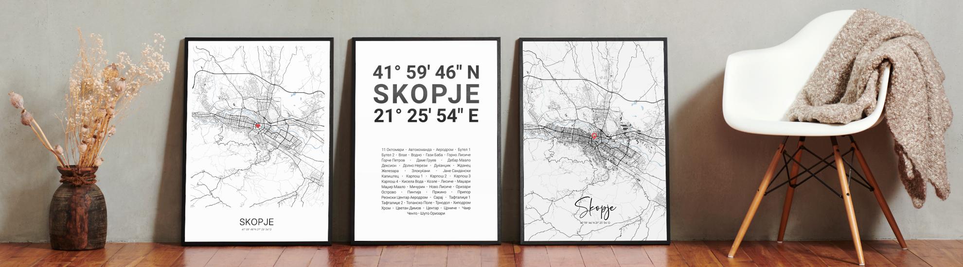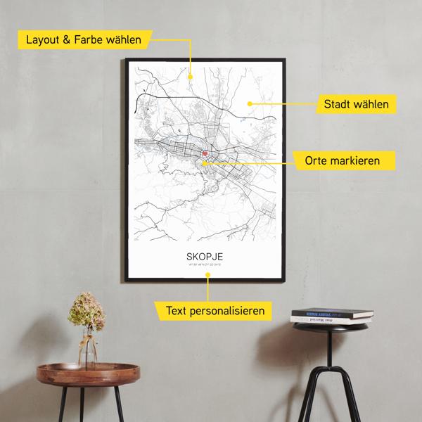 Wähle Farben und Layouts, die perfekt zu dir passen. Ob als klassische Karte in schwarz-weiß oder in modernen Farben. Bei Cartida kannst du ein Design in deinen Lieblingsfarben wählen. Erstelle eine Variante von Skopje, die perfekt zu dir und deiner Wohnung passt.