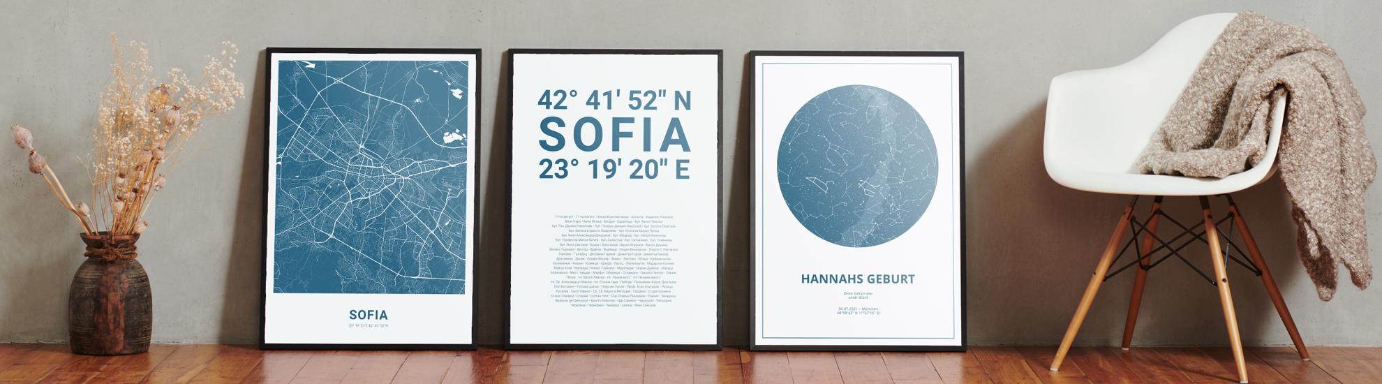 Zahlen, die die Welt bedeuten. Erstelle jetzt dein persönliches Koordinaten-Kunstwerk von deiner Lieblingsstadt. Entscheide selbst, ob Stadtteile, Straßen oder ganz eigene Texte abgedruckt werden. Perfekt als Geschenk zum Einzug oder für die eigenen vier Wände.