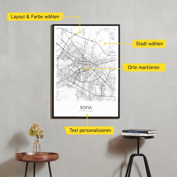 Wähle Farben und Layouts, die perfekt zu dir passen. Ob als klassische Karte in schwarz-weiß oder in modernen Farben. Bei Cartida kannst du ein Design in deinen Lieblingsfarben wählen. Erstelle eine Variante von Sofia, die perfekt zu dir und deiner Wohnung passt.
