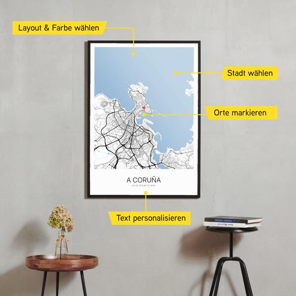 Wähle Farben und Layouts, die perfekt zu dir passen. Ob als klassische Karte in schwarz-weiß oder in modernen Farben. Bei Cartida kannst du ein Design in deinen Lieblingsfarben wählen. Erstelle eine Variante von A Coruña, die perfekt zu dir und deiner Wohnung passt.