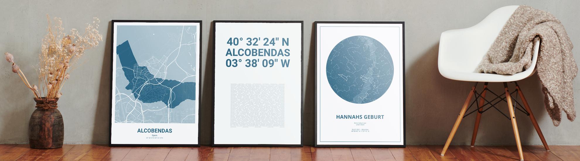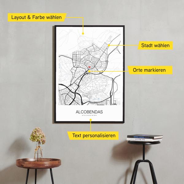 Wähle Farben und Layouts, die perfekt zu dir passen. Ob als klassische Karte in schwarz-weiß oder in modernen Farben. Bei Cartida kannst du ein Design in deinen Lieblingsfarben wählen. Erstelle eine Variante von Alcobendas, die perfekt zu dir und deiner Wohnung passt.