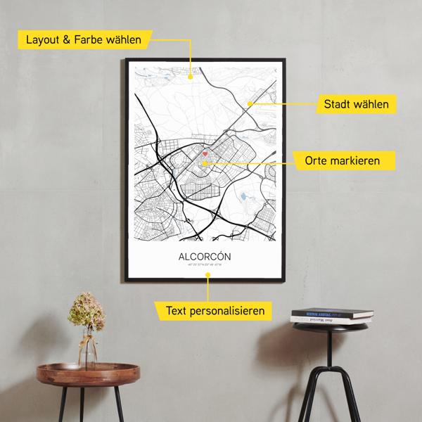 Wähle Farben und Layouts, die perfekt zu dir passen. Ob als klassische Karte in schwarz-weiß oder in modernen Farben. Bei Cartida kannst du ein Design in deinen Lieblingsfarben wählen. Erstelle eine Variante von Alcorcón, die perfekt zu dir und deiner Wohnung passt.