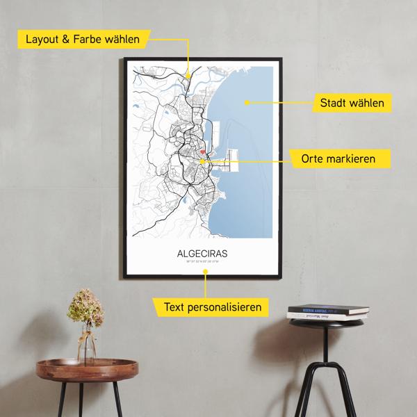 Wähle Farben und Layouts, die perfekt zu dir passen. Ob als klassische Karte in schwarz-weiß oder in modernen Farben. Bei Cartida kannst du ein Design in deinen Lieblingsfarben wählen. Erstelle eine Variante von Algeciras, die perfekt zu dir und deiner Wohnung passt.