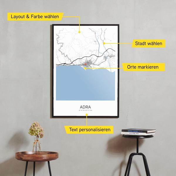 Wähle Farben und Layouts, die perfekt zu dir passen. Ob als klassische Karte in schwarz-weiß oder in modernen Farben. Bei Cartida kannst du ein Design in deinen Lieblingsfarben wählen. Erstelle eine Variante von Adra, die perfekt zu dir und deiner Wohnung passt.