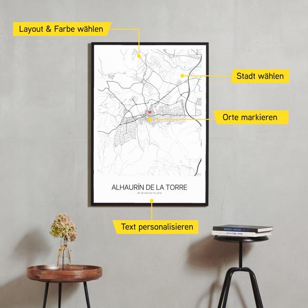 Wähle Farben und Layouts, die perfekt zu dir passen. Ob als klassische Karte in schwarz-weiß oder in modernen Farben. Bei Cartida kannst du ein Design in deinen Lieblingsfarben wählen. Erstelle eine Variante von Alhaurín de la Torre, die perfekt zu dir und deiner Wohnung passt.