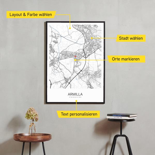 Wähle Farben und Layouts, die perfekt zu dir passen. Ob als klassische Karte in schwarz-weiß oder in modernen Farben. Bei Cartida kannst du ein Design in deinen Lieblingsfarben wählen. Erstelle eine Variante von Armilla, die perfekt zu dir und deiner Wohnung passt.