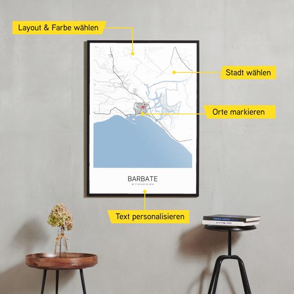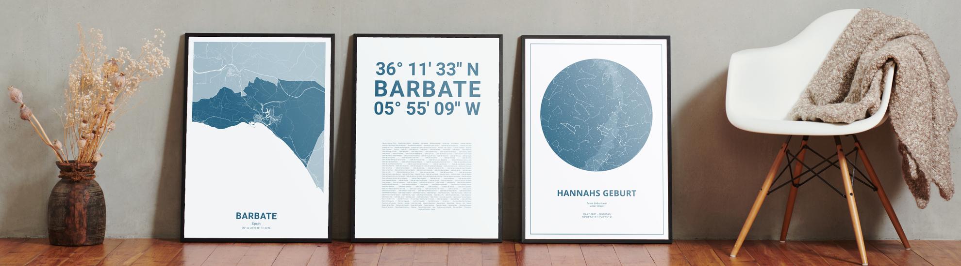 Wähle Farben und Layouts, die perfekt zu dir passen. Ob als klassische Karte in schwarz-weiß oder in modernen Farben. Bei Cartida kannst du ein Design in deinen Lieblingsfarben wählen. Erstelle eine Variante von Barbate, die perfekt zu dir und deiner Wohnung passt.