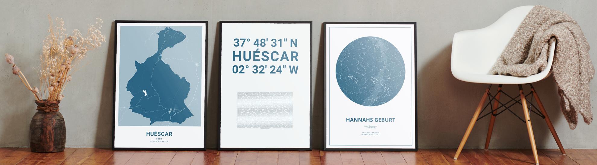 Wähle Farben und Layouts, die perfekt zu dir passen. Ob als klassische Karte in schwarz-weiß oder in modernen Farben. Bei Cartida kannst du ein Design in deinen Lieblingsfarben wählen. Erstelle eine Variante von Huéscar, die perfekt zu dir und deiner Wohnung passt.