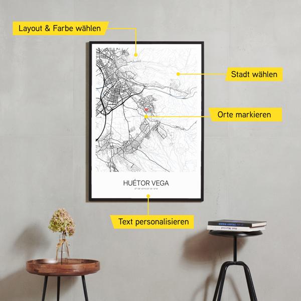 Wähle Farben und Layouts, die perfekt zu dir passen. Ob als klassische Karte in schwarz-weiß oder in modernen Farben. Bei Cartida kannst du ein Design in deinen Lieblingsfarben wählen. Erstelle eine Variante von Huétor Vega, die perfekt zu dir und deiner Wohnung passt.