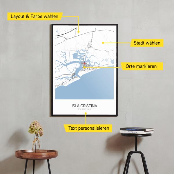 Wähle Farben und Layouts, die perfekt zu dir passen. Ob als klassische Karte in schwarz-weiß oder in modernen Farben. Bei Cartida kannst du ein Design in deinen Lieblingsfarben wählen. Erstelle eine Variante von Isla Cristina, die perfekt zu dir und deiner Wohnung passt.