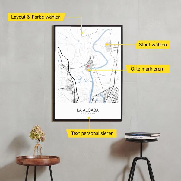 Wähle Farben und Layouts, die perfekt zu dir passen. Ob als klassische Karte in schwarz-weiß oder in modernen Farben. Bei Cartida kannst du ein Design in deinen Lieblingsfarben wählen. Erstelle eine Variante von La Algaba, die perfekt zu dir und deiner Wohnung passt.