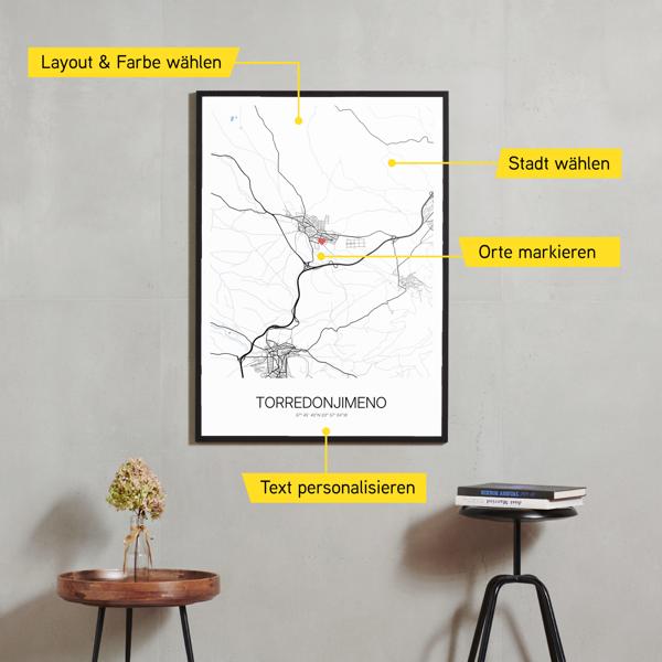 Wähle Farben und Layouts, die perfekt zu dir passen. Ob als klassische Karte in schwarz-weiß oder in modernen Farben. Bei Cartida kannst du ein Design in deinen Lieblingsfarben wählen. Erstelle eine Variante von Torredonjimeno, die perfekt zu dir und deiner Wohnung passt.