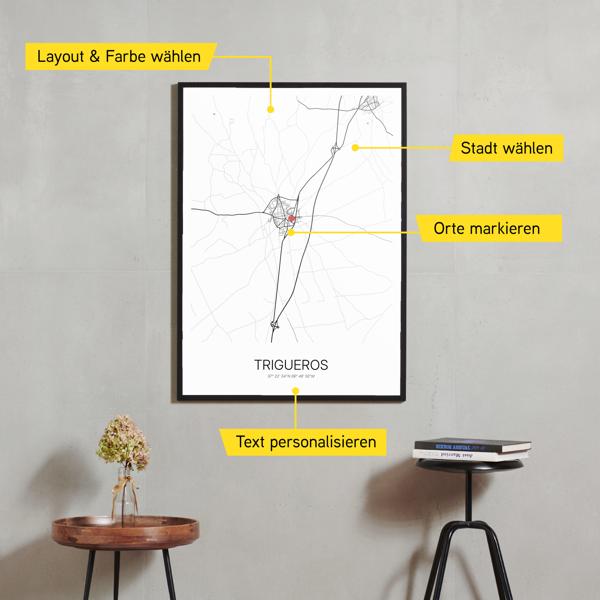 Wähle Farben und Layouts, die perfekt zu dir passen. Ob als klassische Karte in schwarz-weiß oder in modernen Farben. Bei Cartida kannst du ein Design in deinen Lieblingsfarben wählen. Erstelle eine Variante von Trigueros, die perfekt zu dir und deiner Wohnung passt.