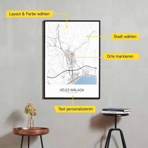 Wähle Farben und Layouts, die perfekt zu dir passen. Ob als klassische Karte in schwarz-weiß oder in modernen Farben. Bei Cartida kannst du ein Design in deinen Lieblingsfarben wählen. Erstelle eine Variante von Vélez-Málaga, die perfekt zu dir und deiner Wohnung passt.