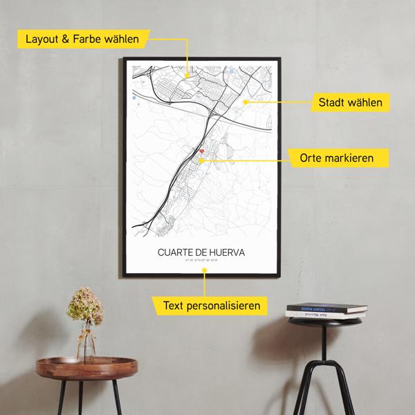 Wähle Farben und Layouts, die perfekt zu dir passen. Ob als klassische Karte in schwarz-weiß oder in modernen Farben. Bei Cartida kannst du ein Design in deinen Lieblingsfarben wählen. Erstelle eine Variante von Cuarte de Huerva, die perfekt zu dir und deiner Wohnung passt.