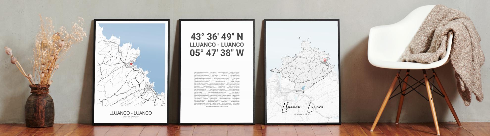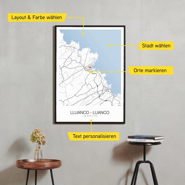 Wähle Farben und Layouts, die perfekt zu dir passen. Ob als klassische Karte in schwarz-weiß oder in modernen Farben. Bei Cartida kannst du ein Design in deinen Lieblingsfarben wählen. Erstelle eine Variante von Lluanco - Luanco, die perfekt zu dir und deiner Wohnung passt.