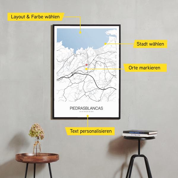 Wähle Farben und Layouts, die perfekt zu dir passen. Ob als klassische Karte in schwarz-weiß oder in modernen Farben. Bei Cartida kannst du ein Design in deinen Lieblingsfarben wählen. Erstelle eine Variante von Piedrasblancas, die perfekt zu dir und deiner Wohnung passt.
