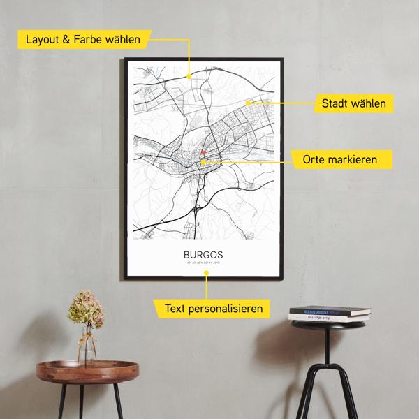 Wähle Farben und Layouts, die perfekt zu dir passen. Ob als klassische Karte in schwarz-weiß oder in modernen Farben. Bei Cartida kannst du ein Design in deinen Lieblingsfarben wählen. Erstelle eine Variante von Burgos, die perfekt zu dir und deiner Wohnung passt.