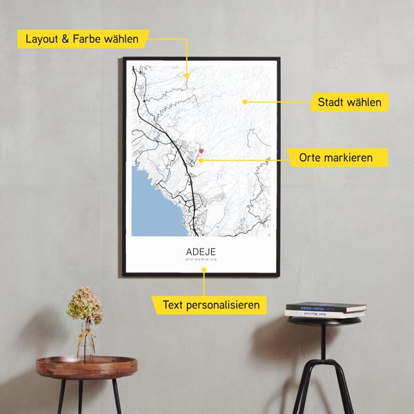 Wähle Farben und Layouts, die perfekt zu dir passen. Ob als klassische Karte in schwarz-weiß oder in modernen Farben. Bei Cartida kannst du ein Design in deinen Lieblingsfarben wählen. Erstelle eine Variante von Adeje, die perfekt zu dir und deiner Wohnung passt.