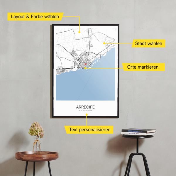 Wähle Farben und Layouts, die perfekt zu dir passen. Ob als klassische Karte in schwarz-weiß oder in modernen Farben. Bei Cartida kannst du ein Design in deinen Lieblingsfarben wählen. Erstelle eine Variante von Arrecife, die perfekt zu dir und deiner Wohnung passt.