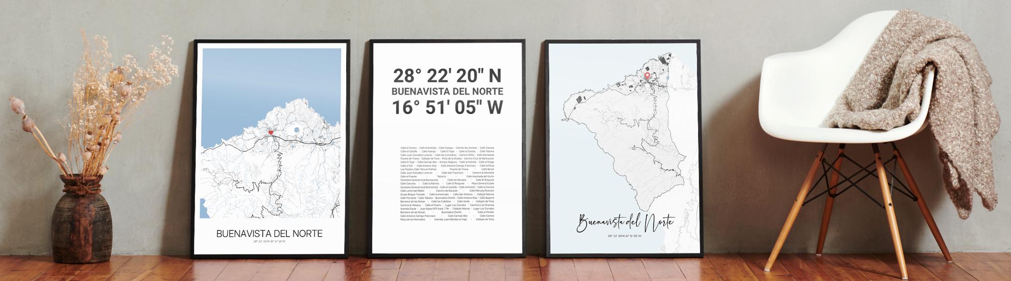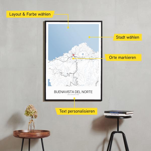 Wähle Farben und Layouts, die perfekt zu dir passen. Ob als klassische Karte in schwarz-weiß oder in modernen Farben. Bei Cartida kannst du ein Design in deinen Lieblingsfarben wählen. Erstelle eine Variante von Buenavista del Norte, die perfekt zu dir und deiner Wohnung passt.