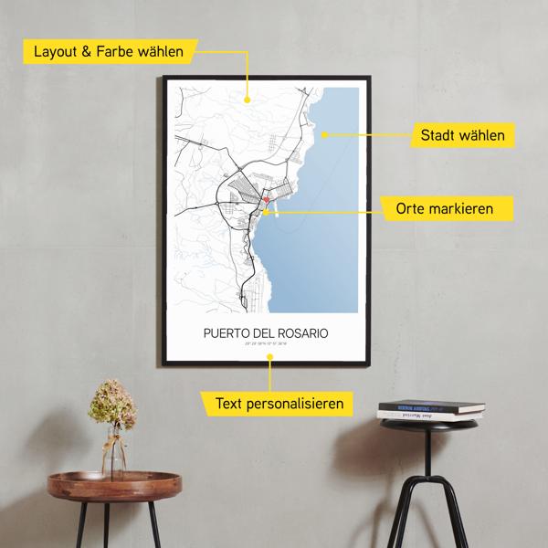 Wähle Farben und Layouts, die perfekt zu dir passen. Ob als klassische Karte in schwarz-weiß oder in modernen Farben. Bei Cartida kannst du ein Design in deinen Lieblingsfarben wählen. Erstelle eine Variante von Puerto del Rosario, die perfekt zu dir und deiner Wohnung passt.