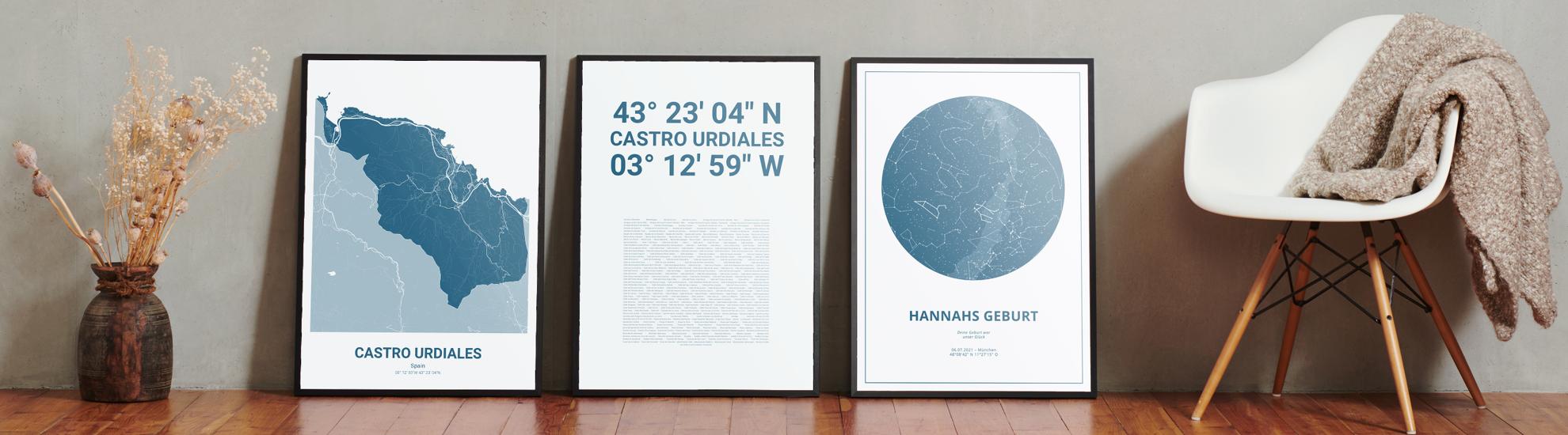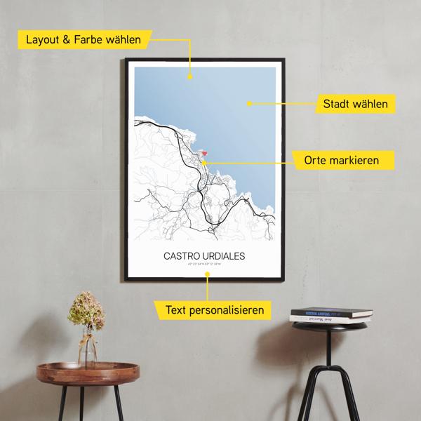 Wähle Farben und Layouts, die perfekt zu dir passen. Ob als klassische Karte in schwarz-weiß oder in modernen Farben. Bei Cartida kannst du ein Design in deinen Lieblingsfarben wählen. Erstelle eine Variante von Castro Urdiales, die perfekt zu dir und deiner Wohnung passt.