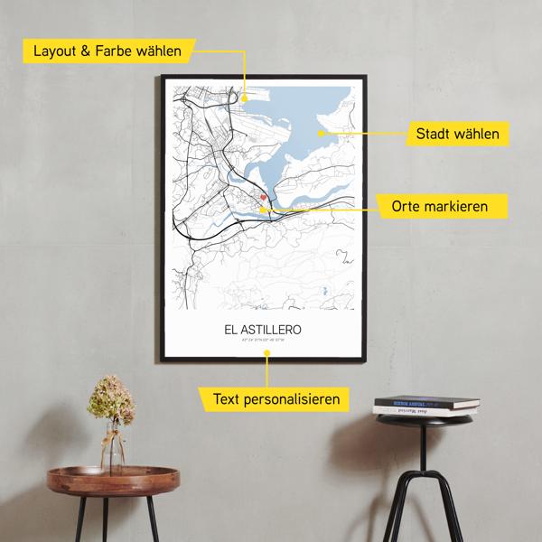 Wähle Farben und Layouts, die perfekt zu dir passen. Ob als klassische Karte in schwarz-weiß oder in modernen Farben. Bei Cartida kannst du ein Design in deinen Lieblingsfarben wählen. Erstelle eine Variante von El Astillero, die perfekt zu dir und deiner Wohnung passt.