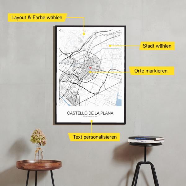 Wähle Farben und Layouts, die perfekt zu dir passen. Ob als klassische Karte in schwarz-weiß oder in modernen Farben. Bei Cartida kannst du ein Design in deinen Lieblingsfarben wählen. Erstelle eine Variante von Castelló de la Plana, die perfekt zu dir und deiner Wohnung passt.