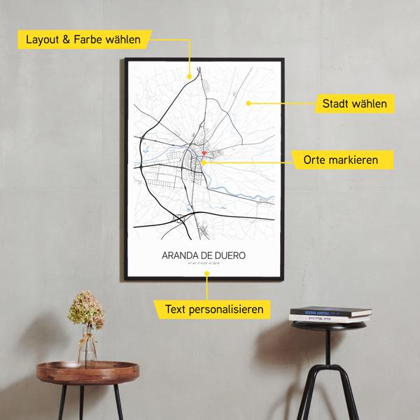 Wähle Farben und Layouts, die perfekt zu dir passen. Ob als klassische Karte in schwarz-weiß oder in modernen Farben. Bei Cartida kannst du ein Design in deinen Lieblingsfarben wählen. Erstelle eine Variante von Aranda de Duero, die perfekt zu dir und deiner Wohnung passt.