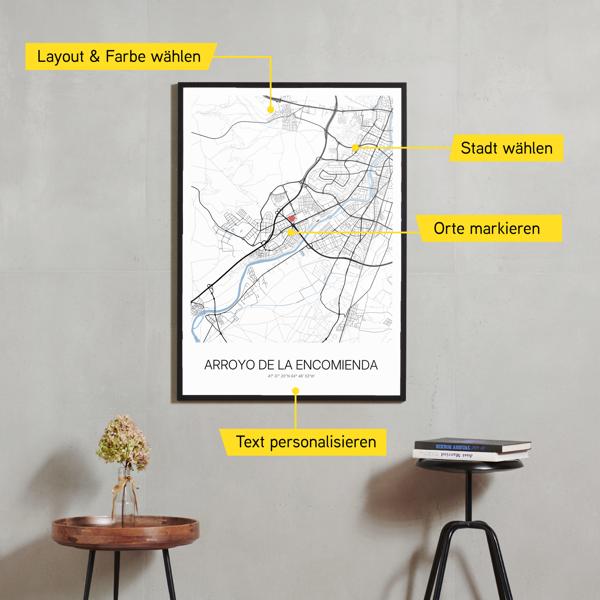 Wähle Farben und Layouts, die perfekt zu dir passen. Ob als klassische Karte in schwarz-weiß oder in modernen Farben. Bei Cartida kannst du ein Design in deinen Lieblingsfarben wählen. Erstelle eine Variante von Arroyo de la Encomienda, die perfekt zu dir und deiner Wohnung passt.