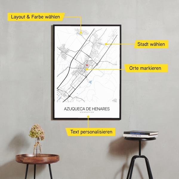 Wähle Farben und Layouts, die perfekt zu dir passen. Ob als klassische Karte in schwarz-weiß oder in modernen Farben. Bei Cartida kannst du ein Design in deinen Lieblingsfarben wählen. Erstelle eine Variante von Azuqueca de Henares, die perfekt zu dir und deiner Wohnung passt.
