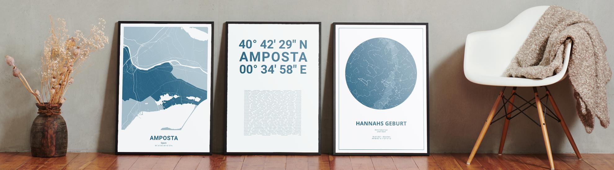 Zahlen, die die Welt bedeuten. Erstelle jetzt dein persönliches Koordinaten-Kunstwerk von deiner Lieblingsstadt. Entscheide selbst, ob Stadtteile, Straßen oder ganz eigene Texte abgedruckt werden. Perfekt als Geschenk zum Einzug oder für die eigenen vier Wände.