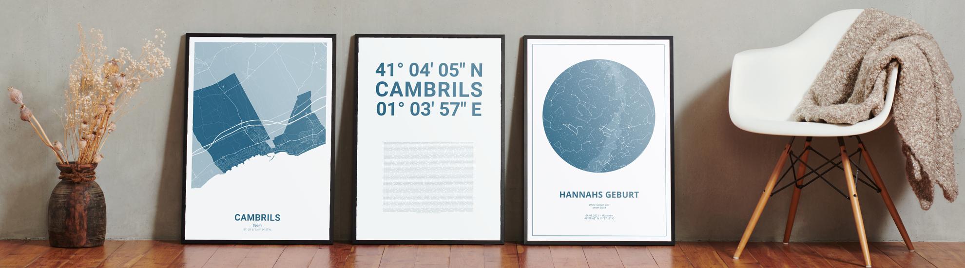 Wähle Farben und Layouts, die perfekt zu dir passen. Ob als klassische Karte in schwarz-weiß oder in modernen Farben. Bei Cartida kannst du ein Design in deinen Lieblingsfarben wählen. Erstelle eine Variante von Cambrils, die perfekt zu dir und deiner Wohnung passt.