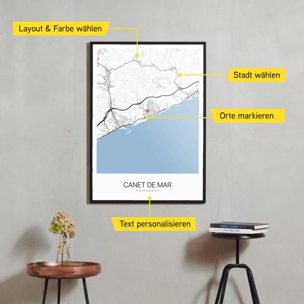 Wähle Farben und Layouts, die perfekt zu dir passen. Ob als klassische Karte in schwarz-weiß oder in modernen Farben. Bei Cartida kannst du ein Design in deinen Lieblingsfarben wählen. Erstelle eine Variante von Canet de Mar, die perfekt zu dir und deiner Wohnung passt.