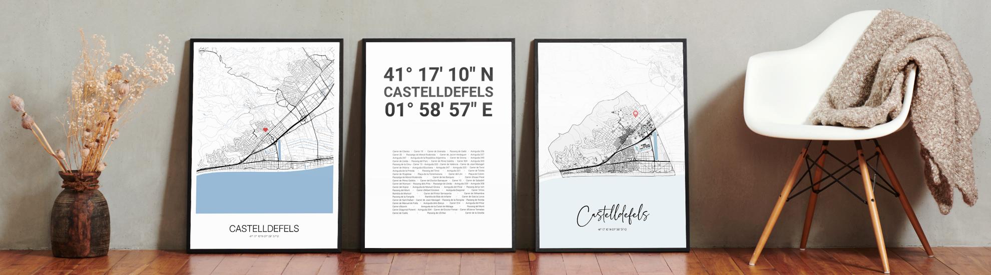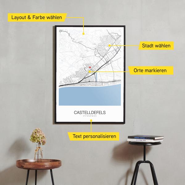 Wähle Farben und Layouts, die perfekt zu dir passen. Ob als klassische Karte in schwarz-weiß oder in modernen Farben. Bei Cartida kannst du ein Design in deinen Lieblingsfarben wählen. Erstelle eine Variante von Castelldefels, die perfekt zu dir und deiner Wohnung passt.