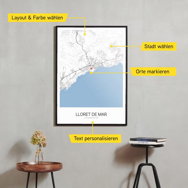 Wähle Farben und Layouts, die perfekt zu dir passen. Ob als klassische Karte in schwarz-weiß oder in modernen Farben. Bei Cartida kannst du ein Design in deinen Lieblingsfarben wählen. Erstelle eine Variante von Lloret de Mar, die perfekt zu dir und deiner Wohnung passt.